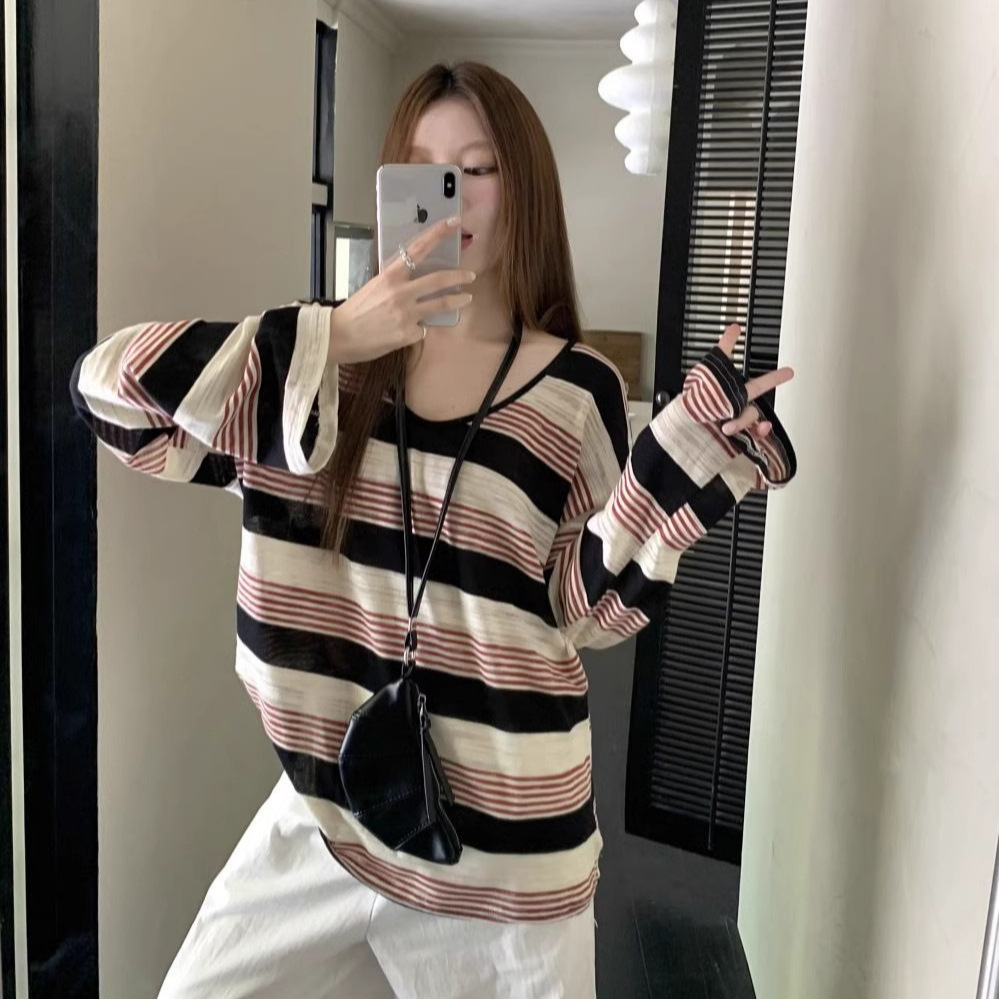 アメリカの大衆ファッションのレトロな長袖のtシャツの春と秋のインナーは底のシャツの外でゆったりしている肩のvネックのストライプの上着を着ます。