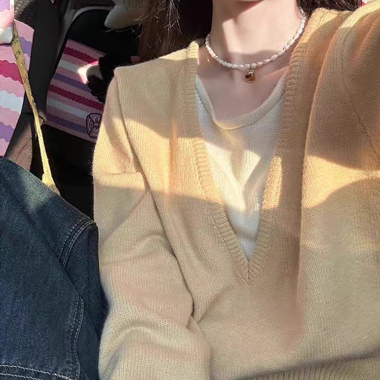 早秋のゆるい怠惰な黄色のつなぎ合わせ偽の2つの衝突色vネックセーターの女性デザイン感の小さなニットの上着
