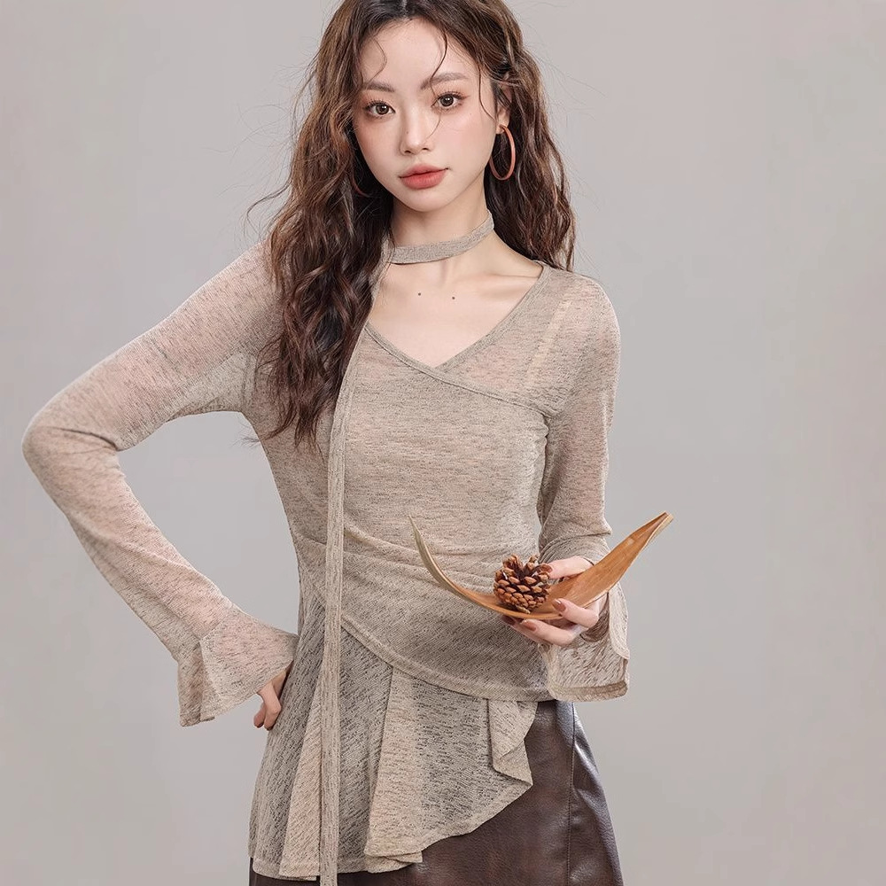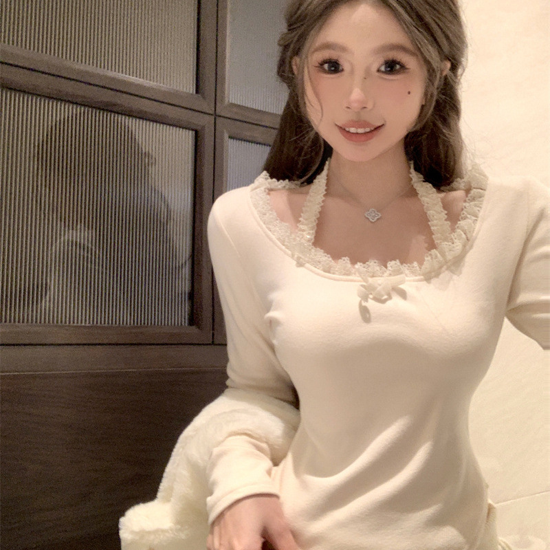 ギャルのセクシーな純欲風レースの蝶結びの長袖のtシャツの女性の秋冬の修身はやせていて不規則に首の上着を掛けます。