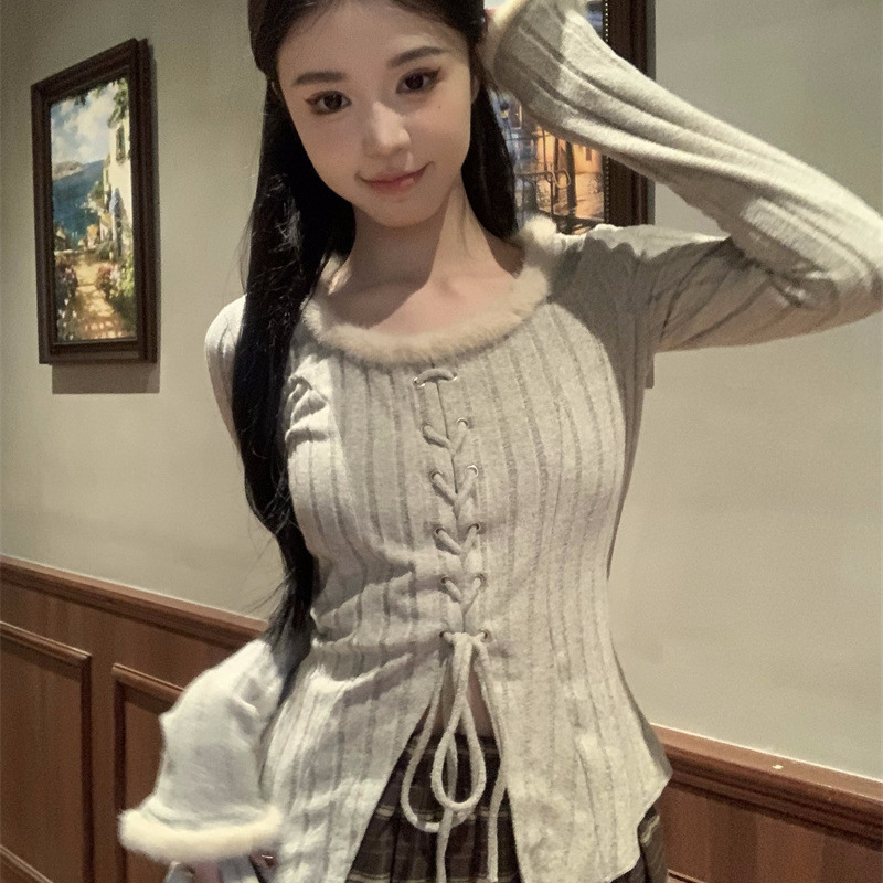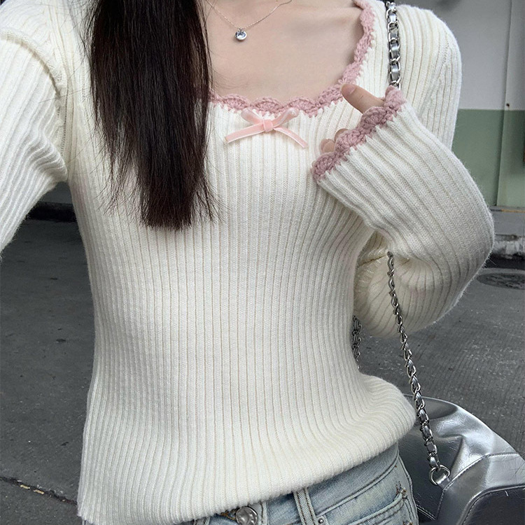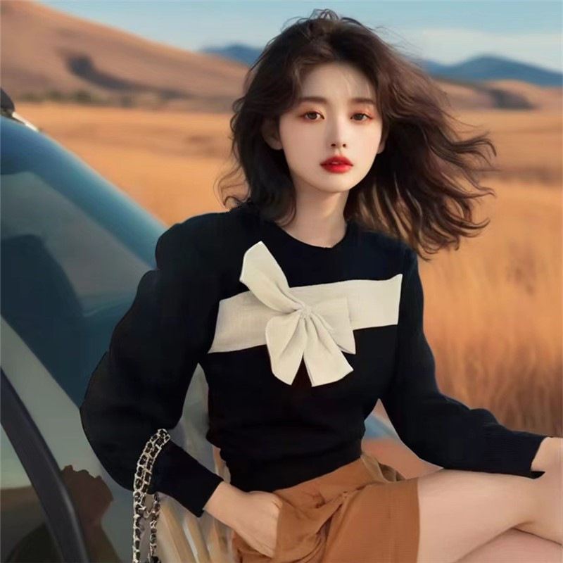 秋冬2024甘いレースファッションニット蝶結びデザイン感長袖tシャツ底ギャルセクシー上着