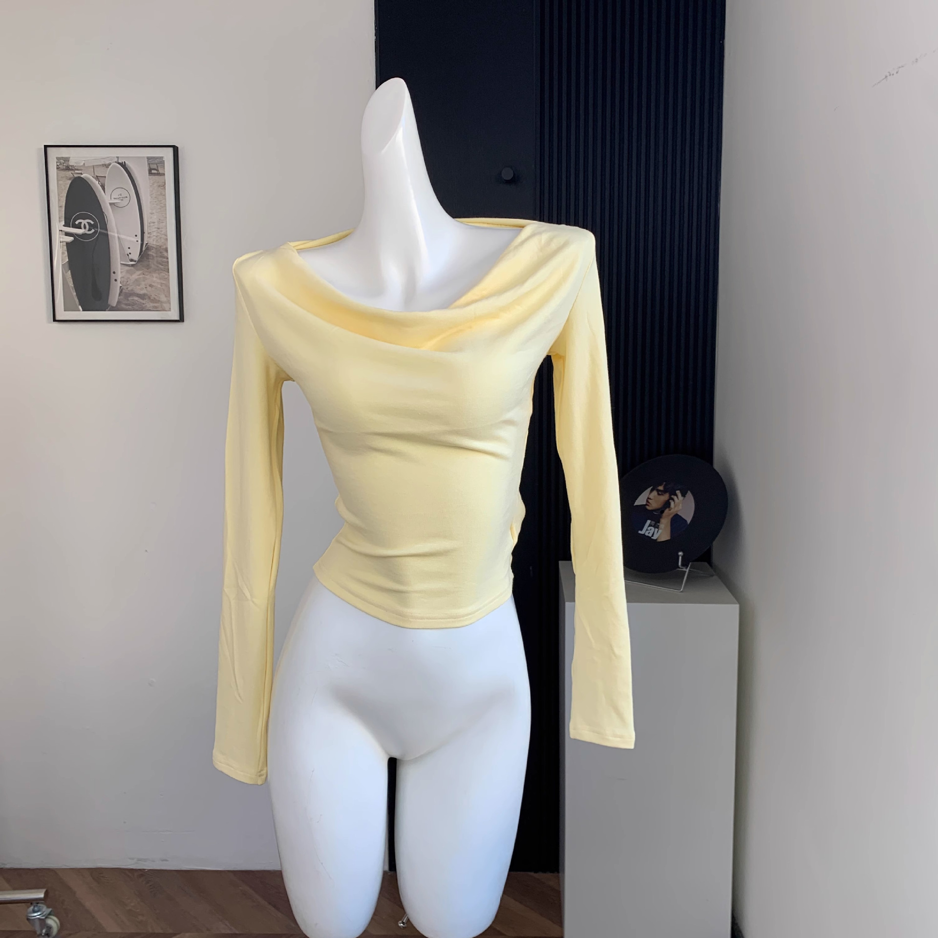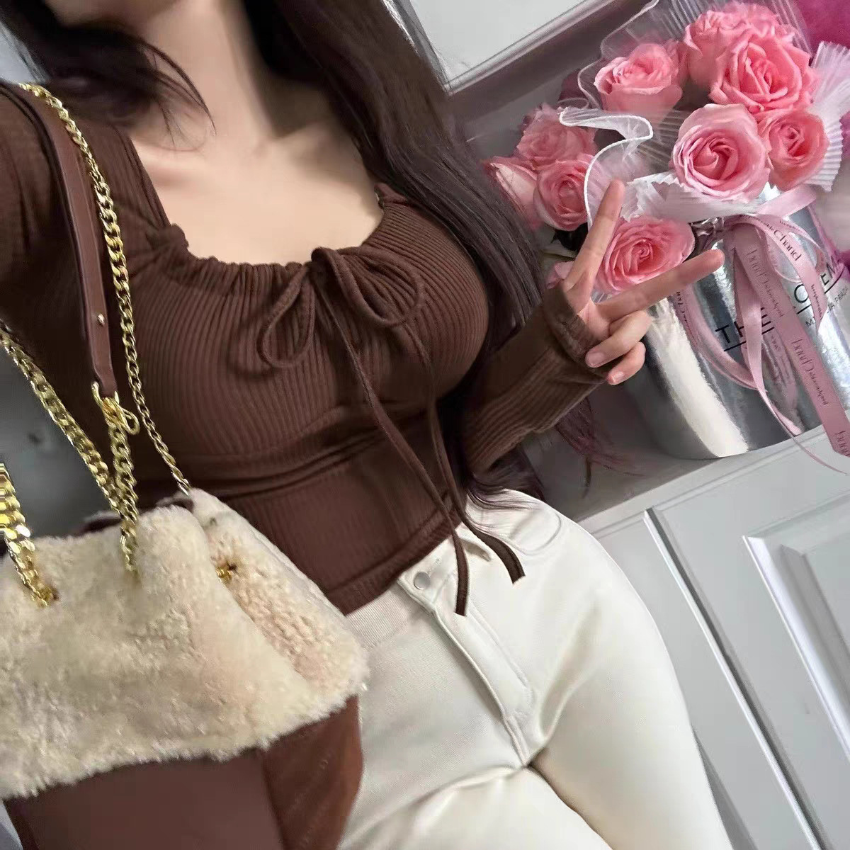 早秋の純欲なギャルの方襟の底のシャツのデザイン感の長袖のtシャツの小さい大衆の独特な修身はやせている上着のinsを現します。