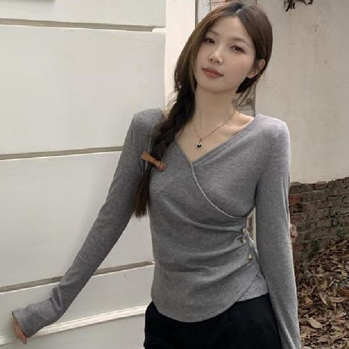 早秋の新型vネックのボタンのデザイン感の偽の2枚の百合の長袖のtシャツの韓国版は色のセクシーなギャルの上着の女性にぶつかります。