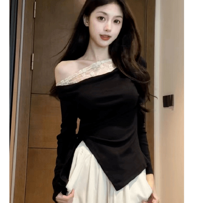 小衆純欲セクシー接ぎレース長袖tシャツ2024早秋スリム肩斜め肩上着ins