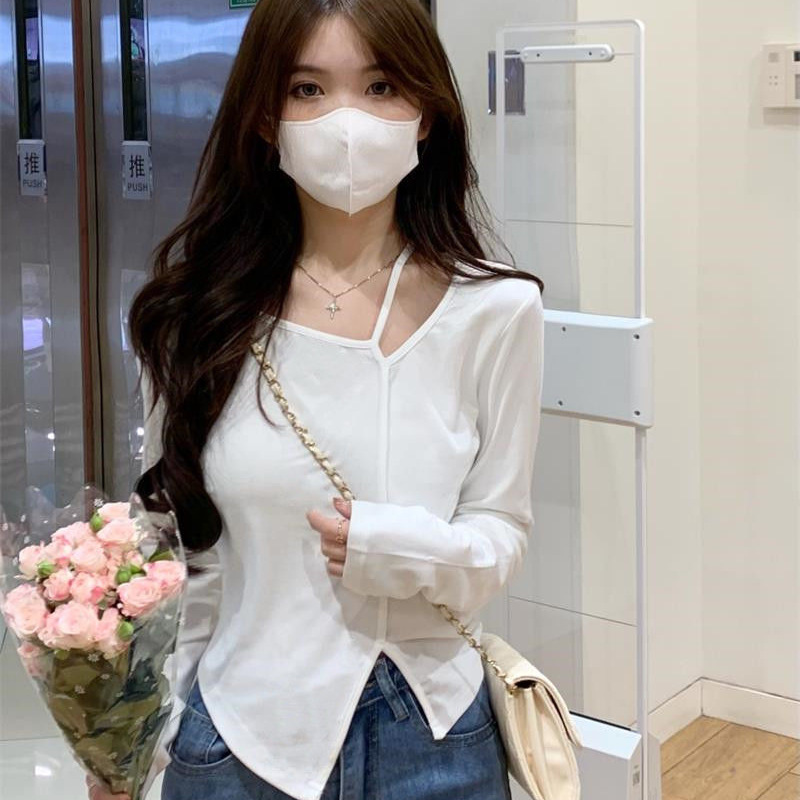 純欲風セクシーな方襟ニット長袖tシャツ秋冬ギャル修身デザイン感オープンフォーク不規則上着