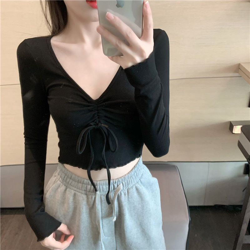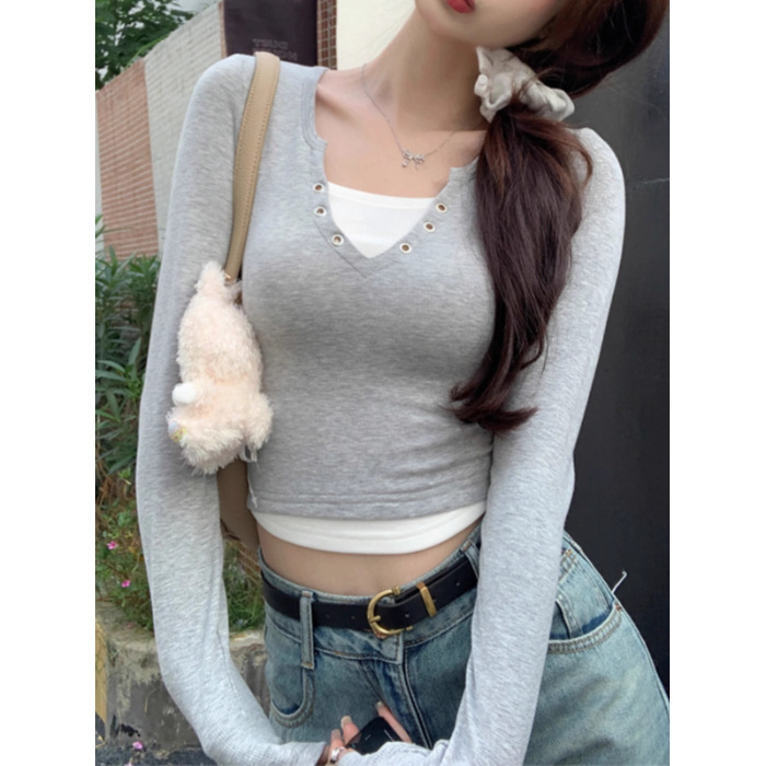 2024秋の新型修身がやせて見えるファッション衝突色vネックtシャツギャルセクシー純欲風長袖ファッション上着