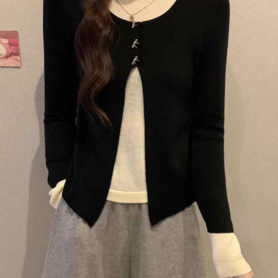 純粋な欲風の甘いギャルのセクシーな衝突色の偽の2つのニットのカーディガンの女性の秋の修身はやせています。