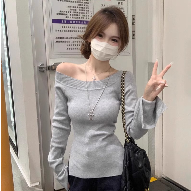 グレー長袖斜め肩ニットtシャツ早秋デザイン感露肩セクシー甘ギャル純欲風小衆上着ins