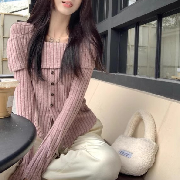 優しいギャル風一字肩つなぎ方襟ニットtシャツ2024新修身が痩せている
