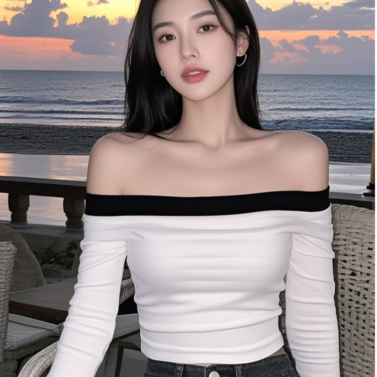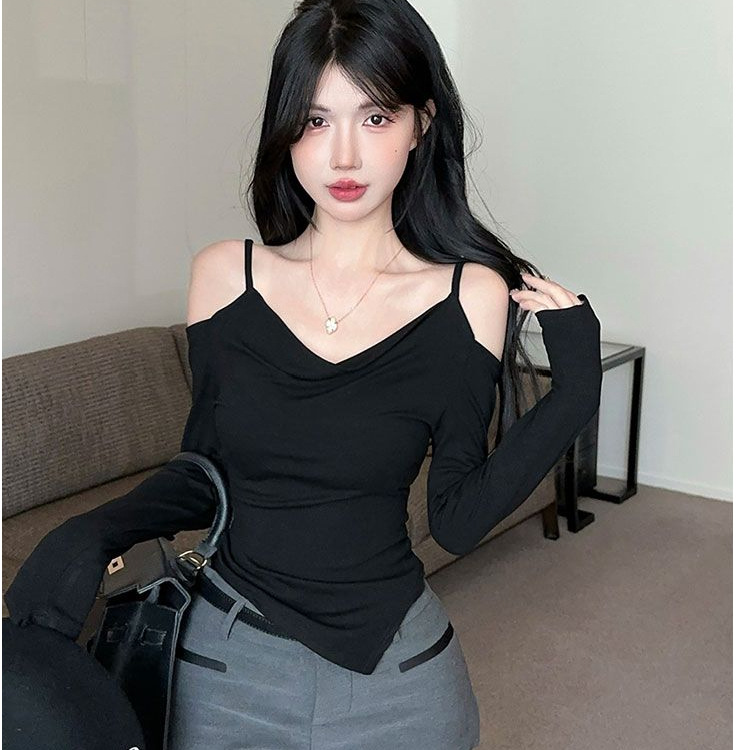 2024新一字肩掛け首長袖打底tシャツ早秋修身痩せ偽二枚セクシー上着ins
