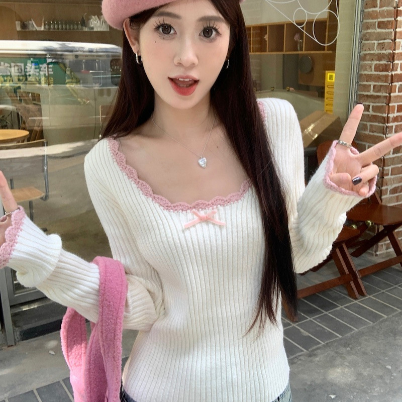 ギャルのセクシーなレースの長袖のニットのtシャツの秋の2024の新型の蝶結びのデザイン感はスリムに見えます。