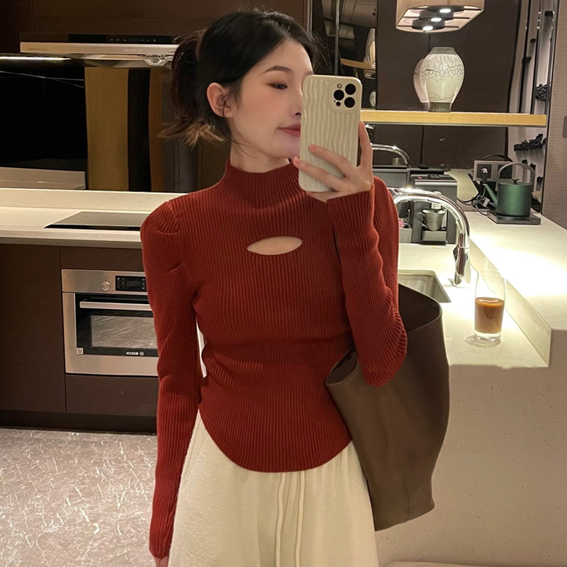 ギャルの半高襟の透かし編みの長袖のtシャツの春秋の新型のフランス式は腰の洋風のセクシーなファッションの上着のinsを絞めます。