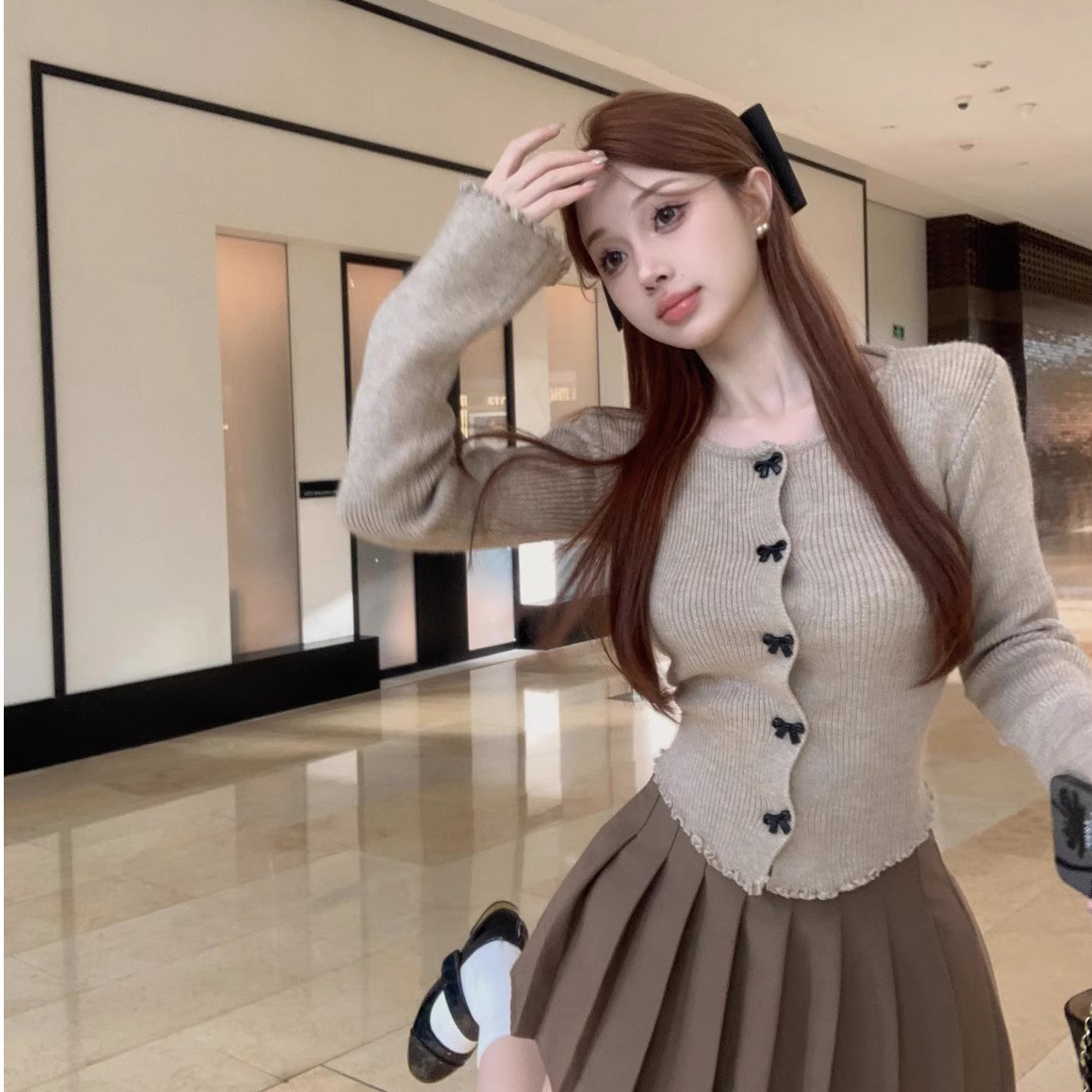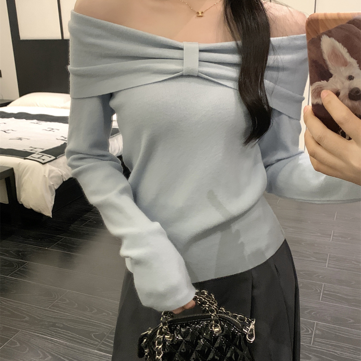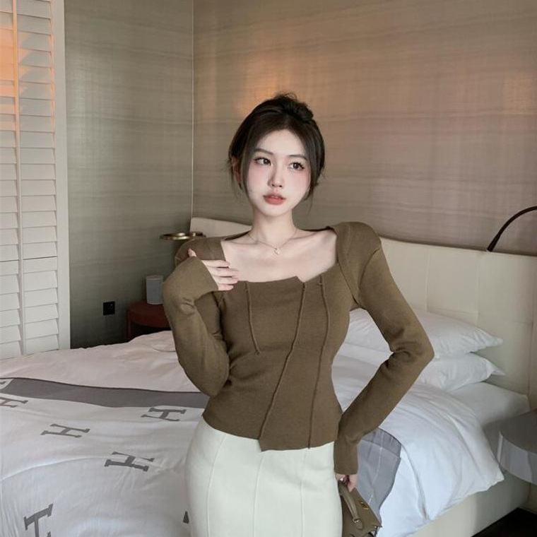 2024秋の新しいフランスの気質の蝶結びの一字襟の長袖のtシャツのデザイン感の雰囲気のギャルの上着ins