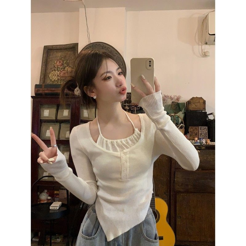 不規則な白い襟の長袖tシャツ2024秋冬の新型ギャルの修身はやせています。