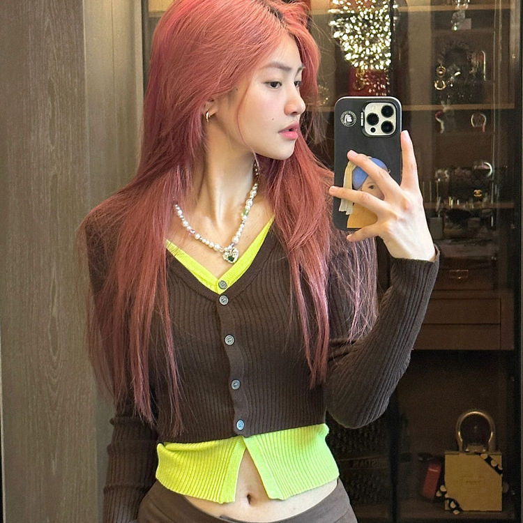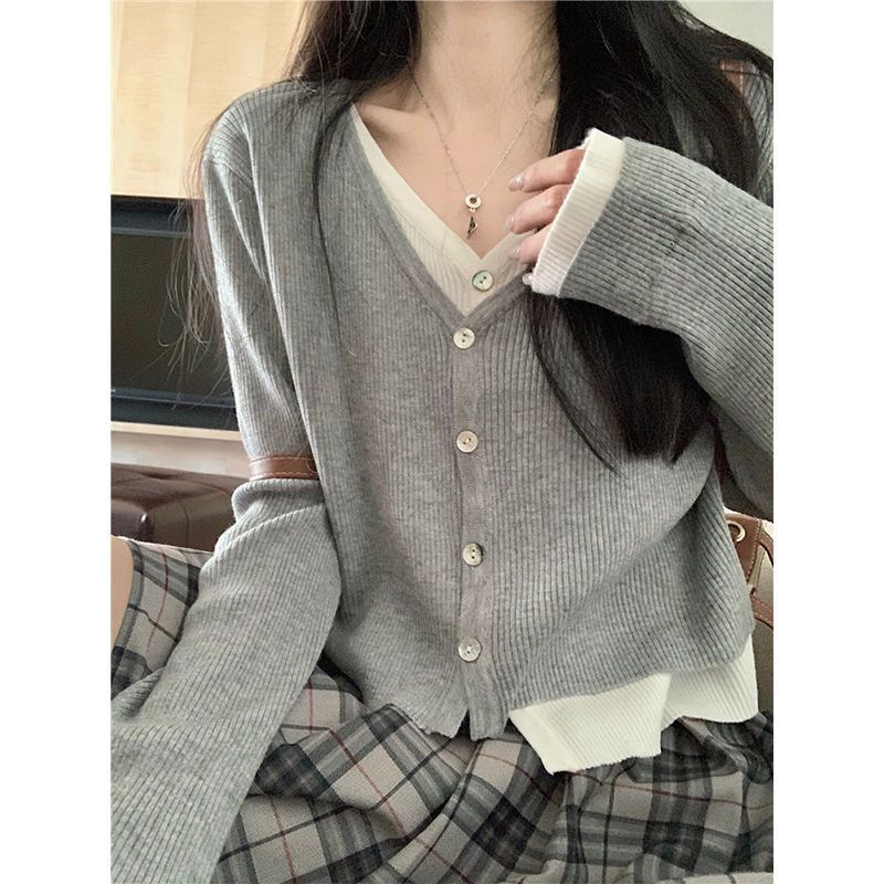 新しいvネックの偽の2つの衝突色のカーディガンの長袖tシャツ2024春秋冬の修身はやせていて怠惰なニットの上着の女性を現します。