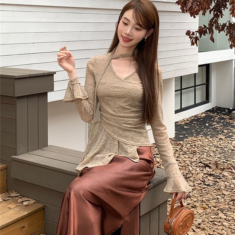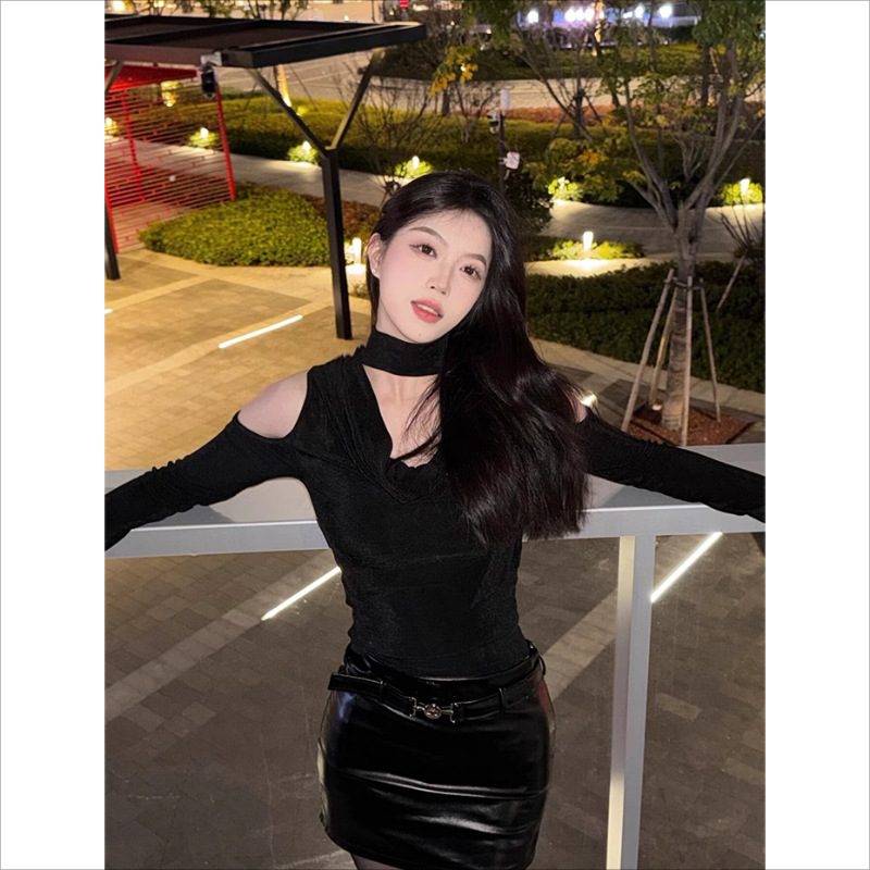 ギャルの肩のvネックの透かし彫りの修身はやせていて、長袖のtシャツの純粋な欲の風のセクシーな大衆のinsの独特な上着に似合います。