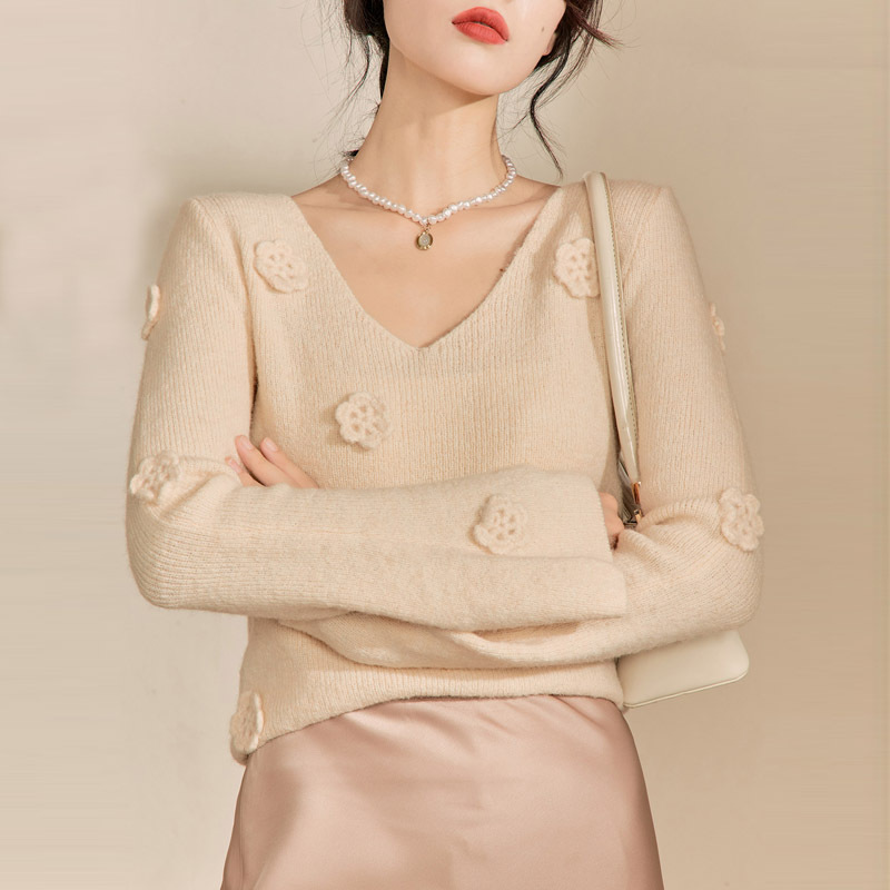ギャルのセクシーなデザイン感vネックの怠惰な風の女性秋の新型の薄いニットの長袖のtシャツは底を打って上着の女性を掛けます。