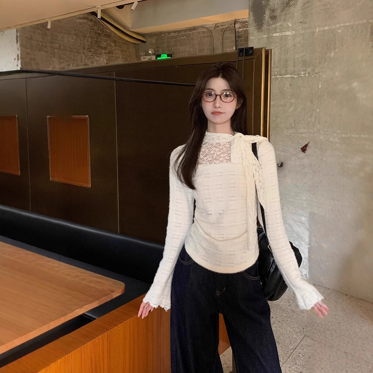 秋のデザイン感小衆純欲蝶結びにレースの長袖tシャツのセクシーな雰囲気が漂っています。