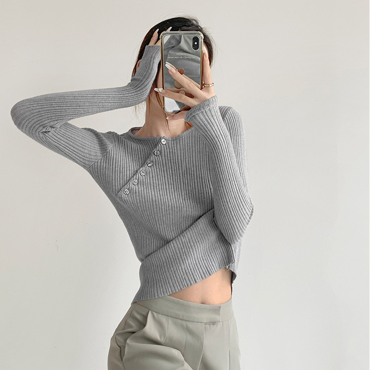不規則な丸首の斜めボタンの長袖tシャツは早秋に身を修めて痩せています。