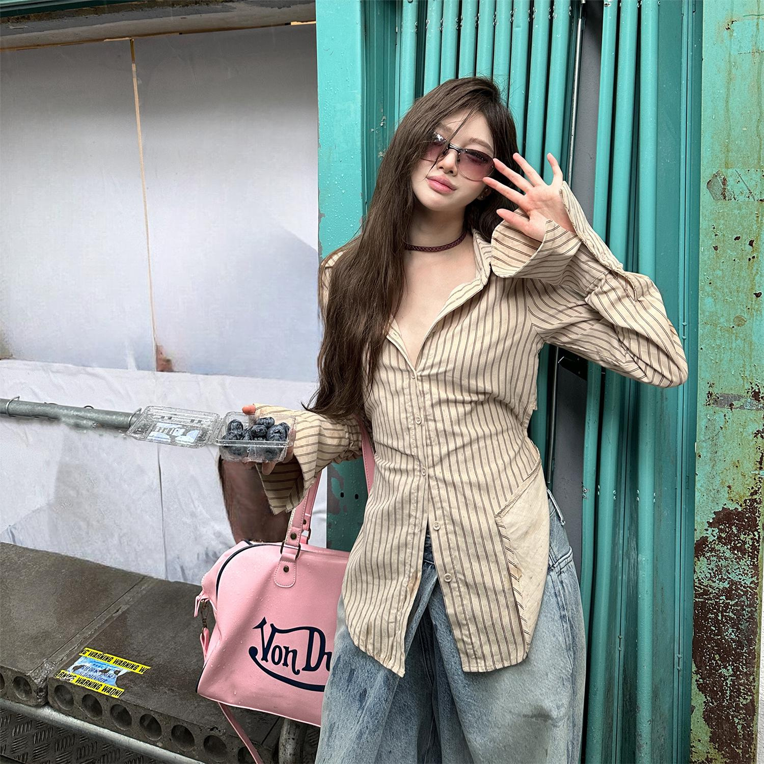 2024年秋の韓国系の甘いギャルの斜め肩のハスの葉の襟の長袖のtシャツの女性の新型のストライプのデザイン感の上着のins