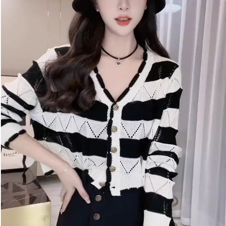 2024新型の甘いギャルのセクシーなニットの秋のゆったりしたtシャツの長袖の小さい香風のvネックの透かし彫りのストライプの上着の女性