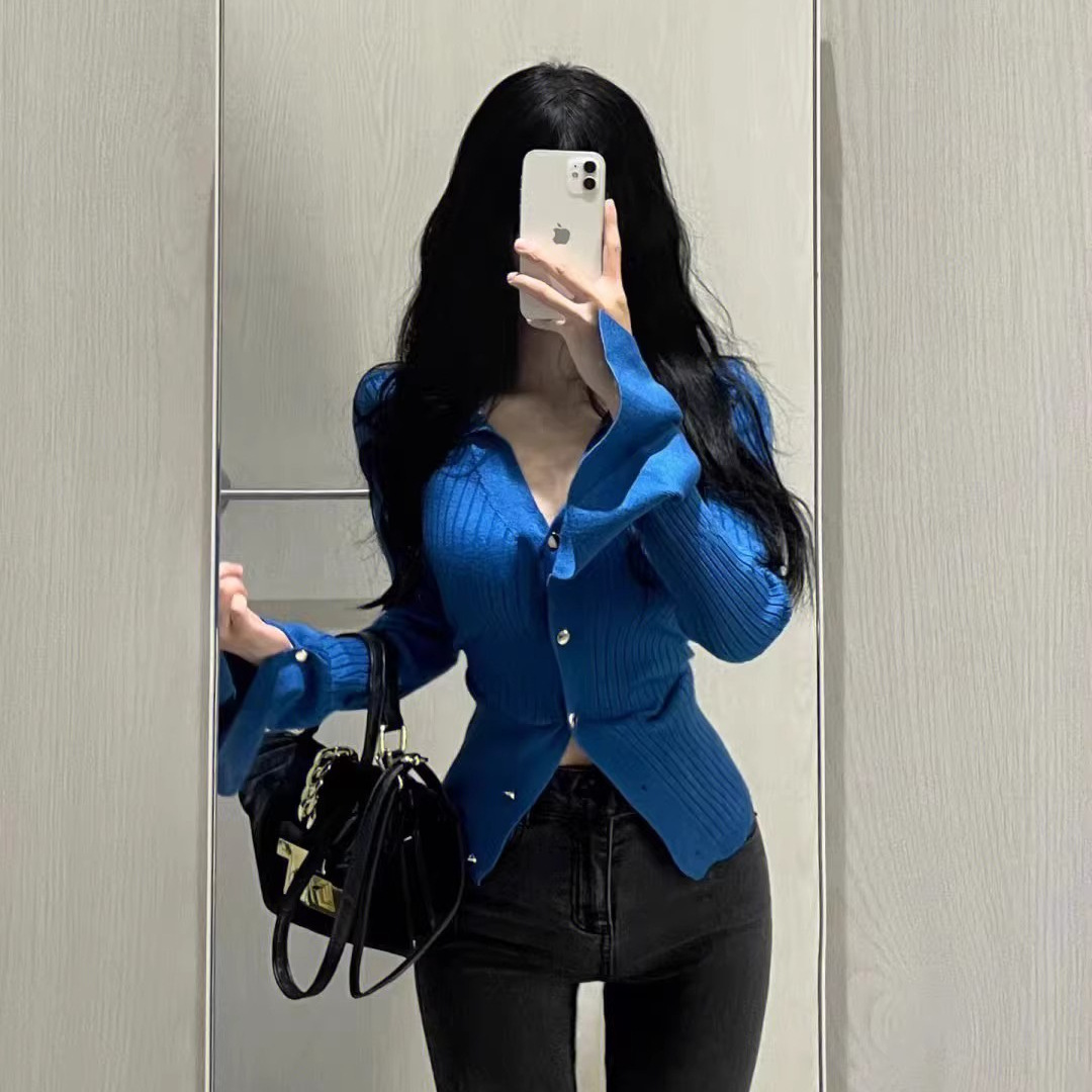 2024早秋新作ファッションデザイン感ブルーvネックニットカーディガン長袖tシャツスリム着痩せ上着ins