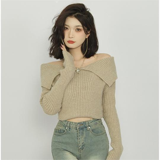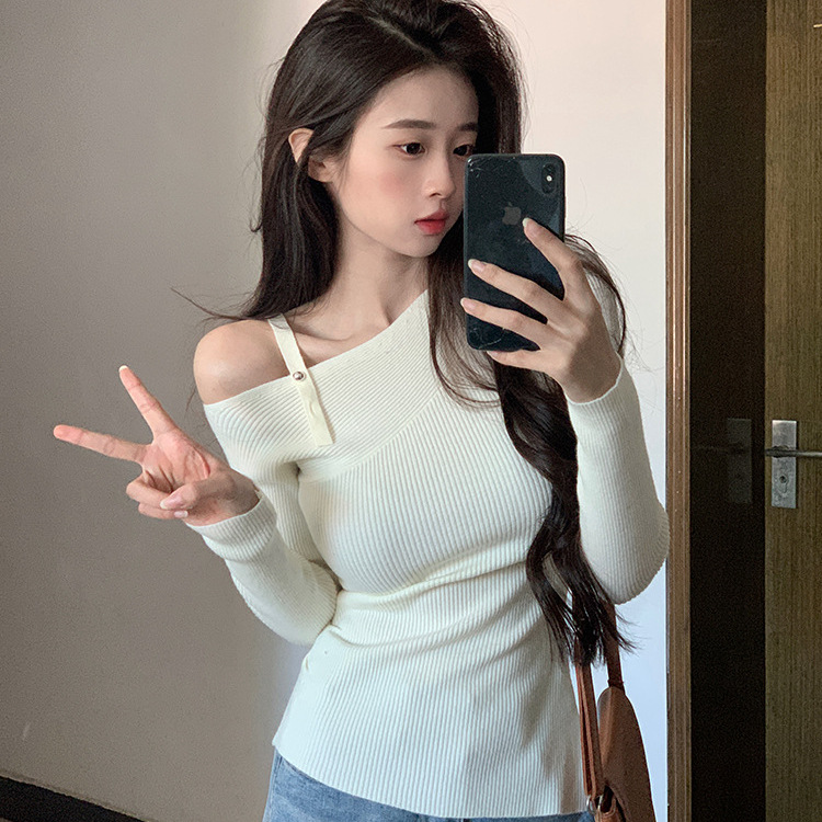 フランス式の美しい鎖骨ギャルのセクシーな一字の肩の長袖のtシャツの2024年の秋冬の新型のニットの上着のins