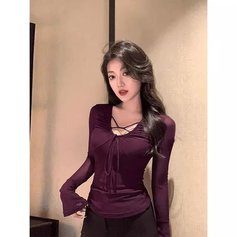 秋冬のギャルのセクシーな純欲風の長袖のtシャツは保温して身を修めるのが見えます。