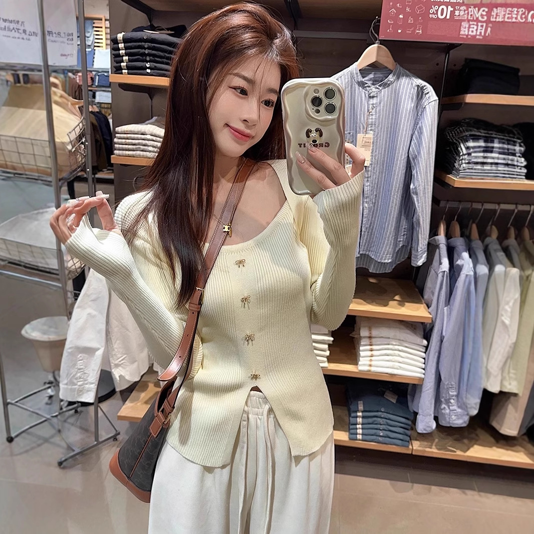 ギャルニットカーディガン長袖tシャツ2024秋の新型偽のデザイン感が色にぶつかったファッション上着