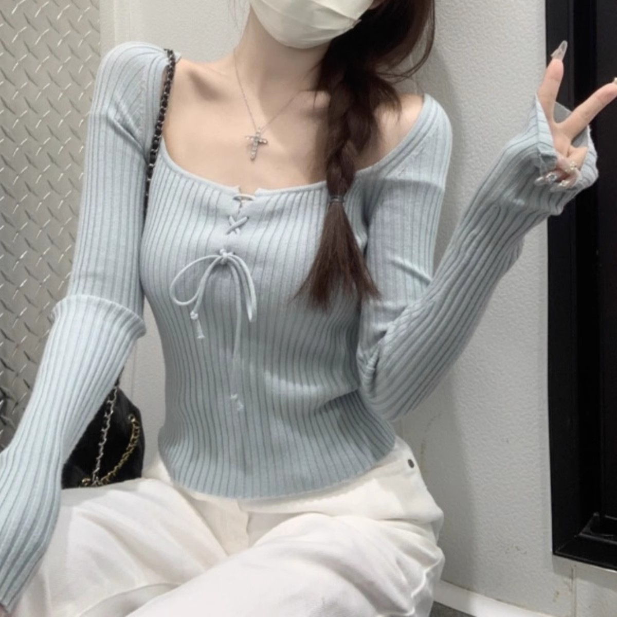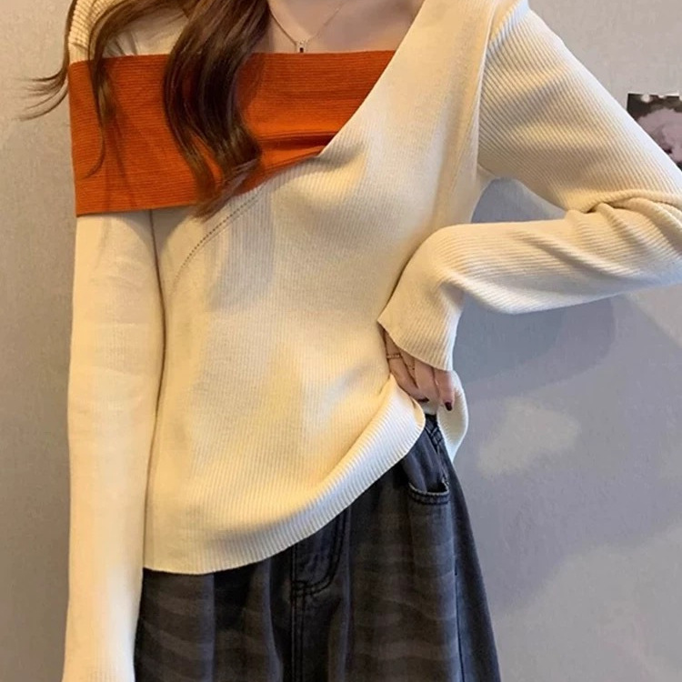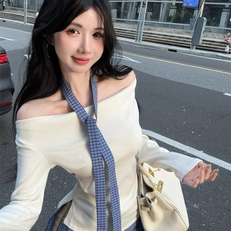 純欲鎖骨角襟ニット秋長袖tシャツ小衆ギャルセクシーデザイン感スリム着痩せ上着ins