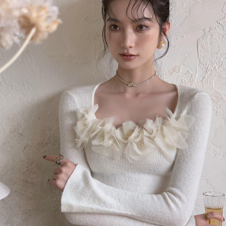 フランスのユニークな立体花の修身はやせているニットの底のシャツのtシャツの秋冬のギャルのセクシーな純欲の上着を現します。