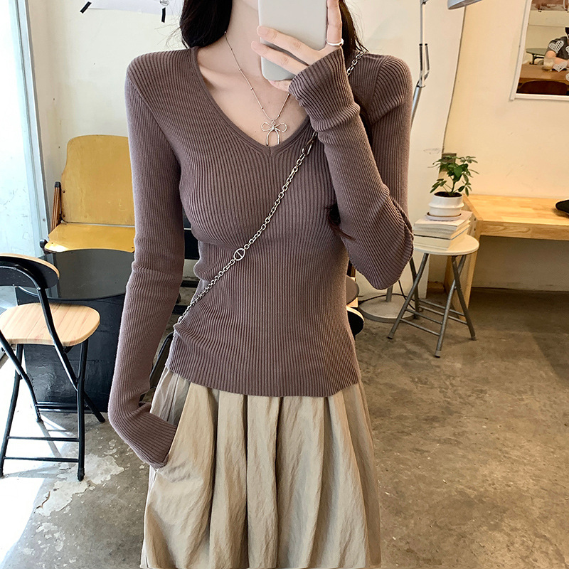 純粋な欲風の柔らかいモチモチのvネックの長袖のニットのtシャツの2024秋冬の修身はやせています。