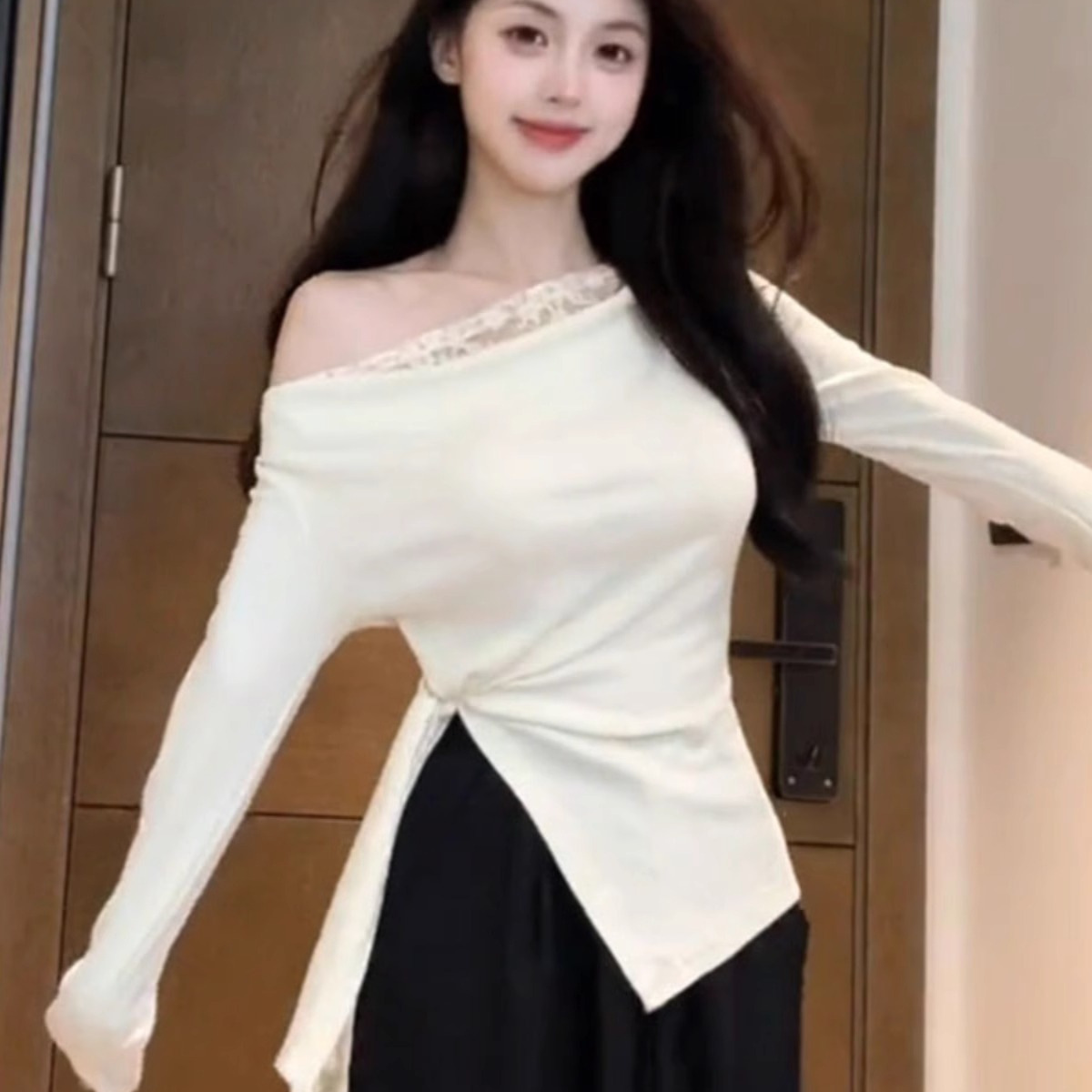 ギャルのセクシーな肩のレースは長袖のtシャツをつなぎ合わせます。