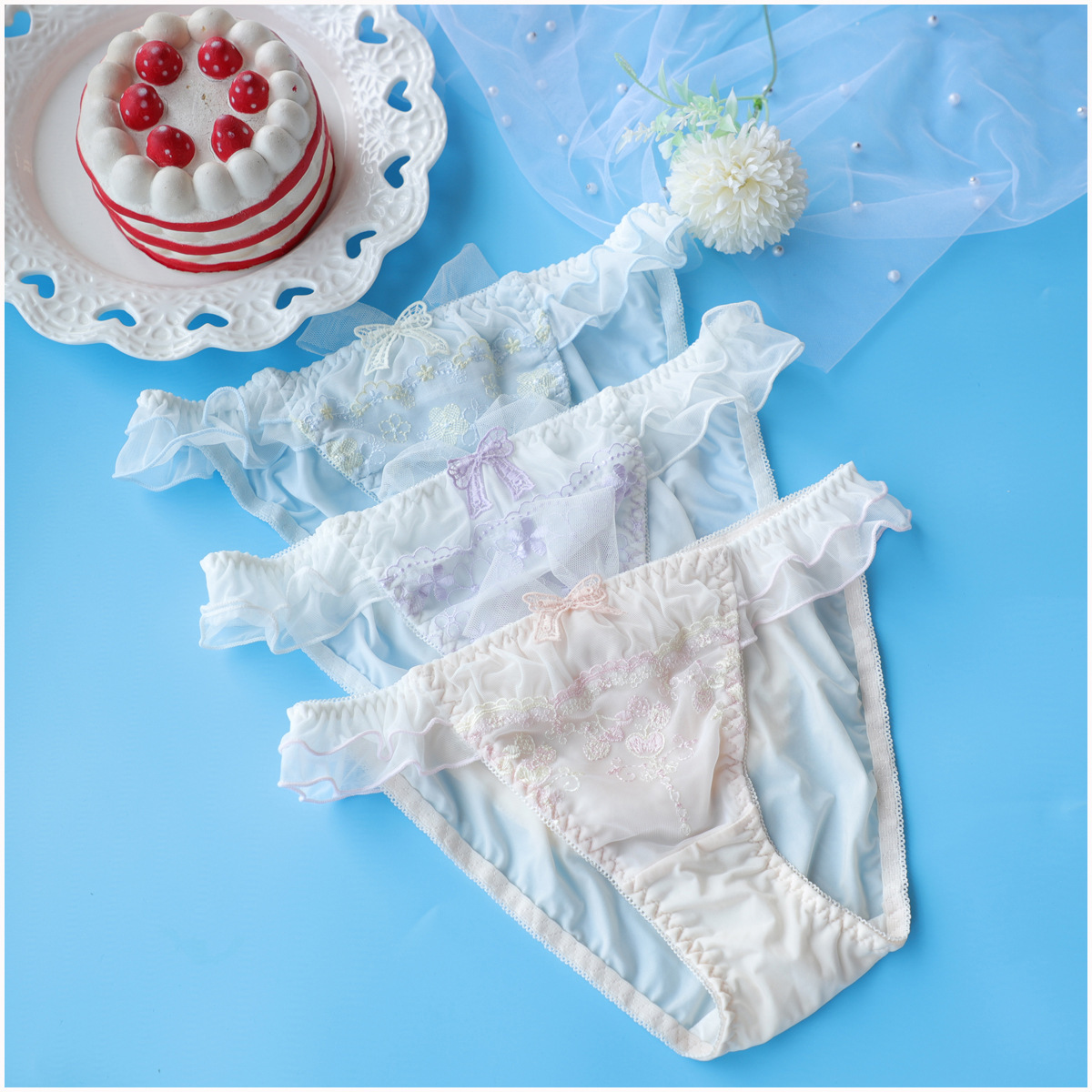 日本の氷の糸の快適なセクシーな刺繍の飛辺の少女のミルクの糸の蝶結びの甘い下着の女性のかわいい三角のズボン