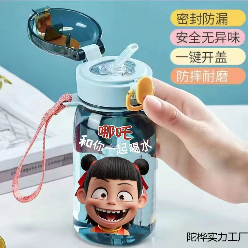 哪吒儿童吸管塑料水杯子男孩女陔卡通上学便携耐食品提绳加厚加宽