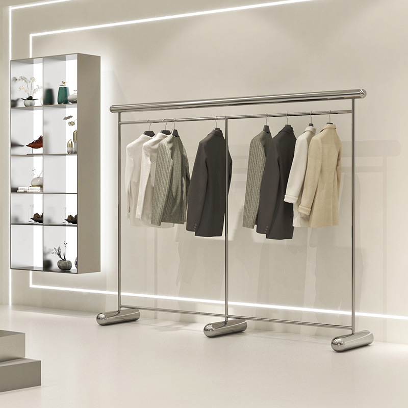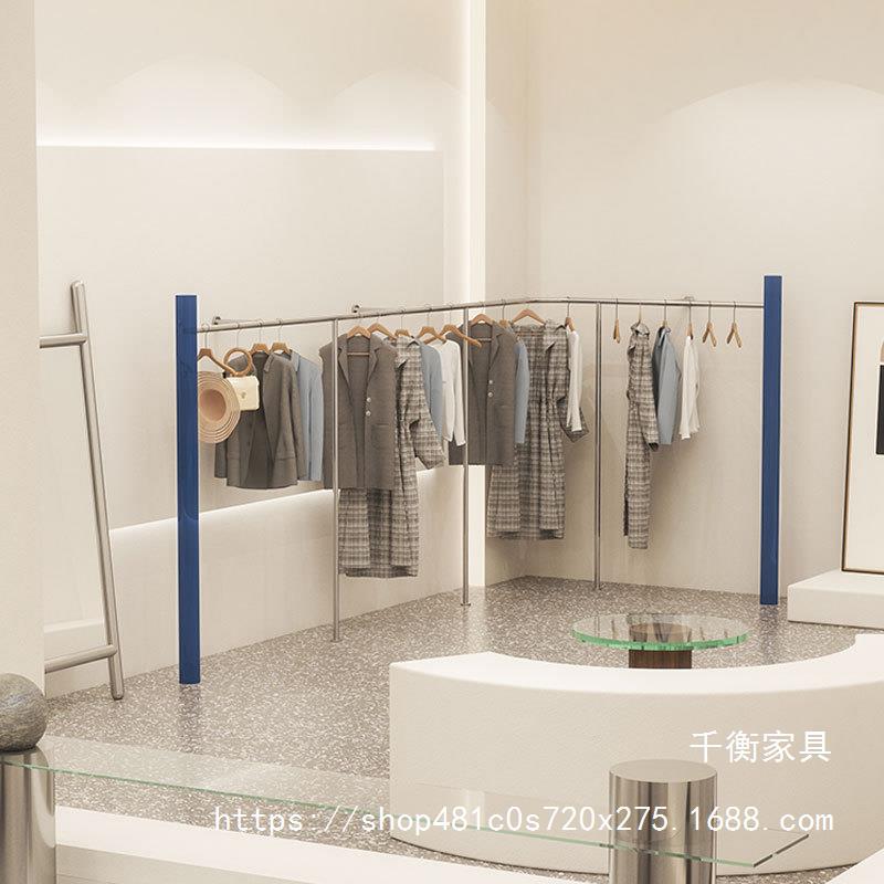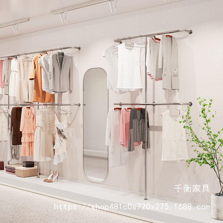 壁側吊り下げステンレス鋼衣料品店ディスプレイラックつや消しシルバー婦人服店吊り下げロッドディスプレイラック壁棚