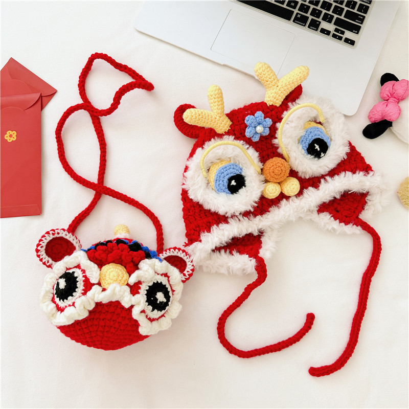 中国風の正月の子供の斜めな包みのトラの頭の目を覚ますライオンのかわいいお祝いの手作りの毛糸の包みの完成品の目を覚ますライオンの帽子