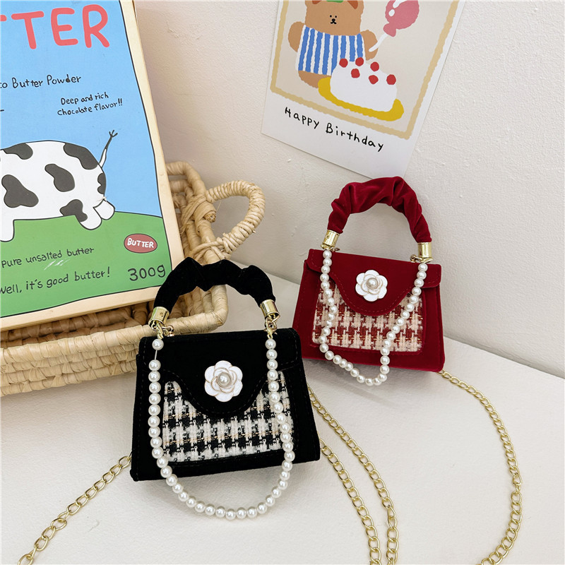 新商品の小香風のハンドバッグ真珠のツバキの花の毛は子供の斜めのショルダーバッグの女の子の王女のフランス式のミニの包みです。