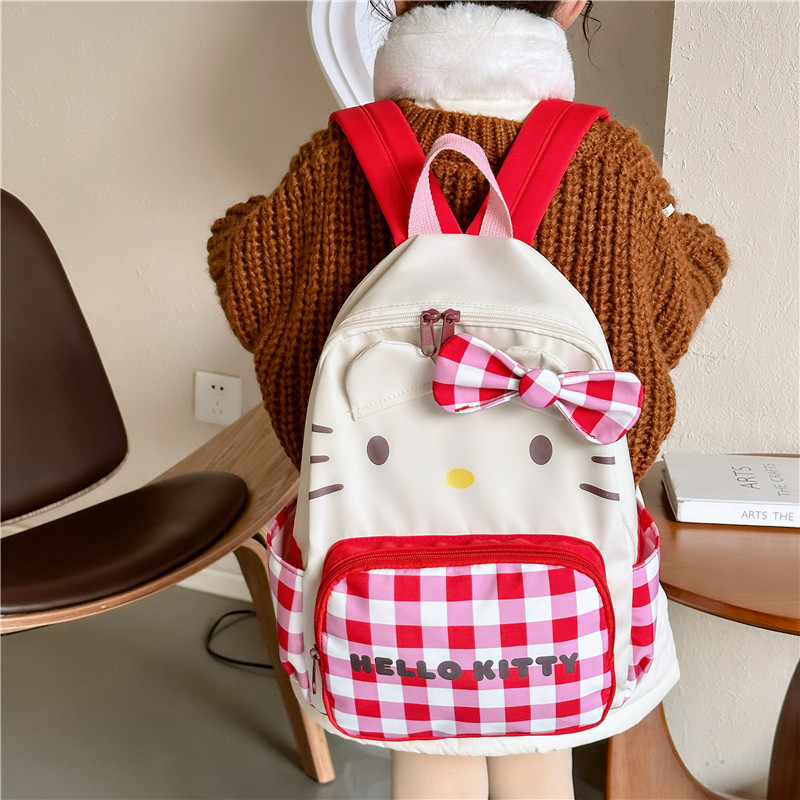 新しい子供のランドセル幼稚園のかわいいkt猫の子供のランドセルの格子の漫画の蝶結びの軽いリュックサック