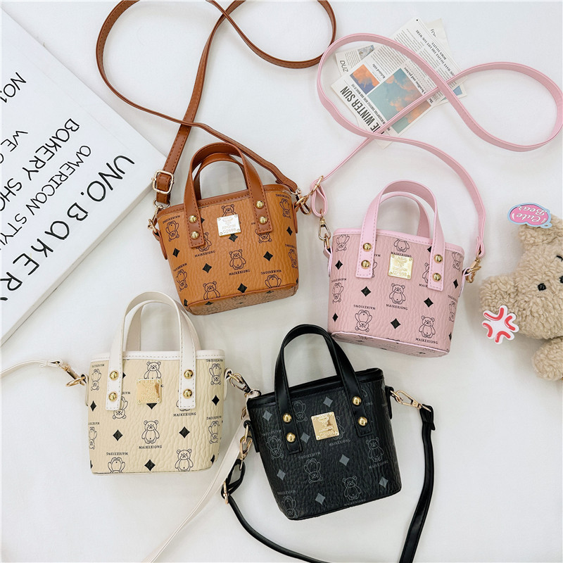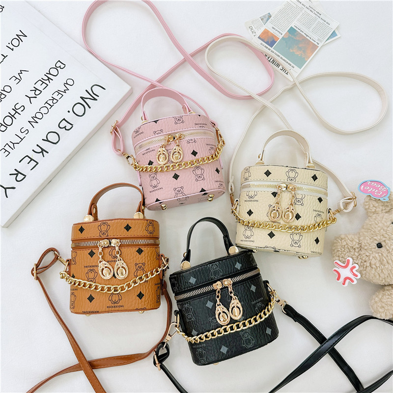 新しいブランドファッション子供バッグpuプリント手持ちバケツミニ化粧バッグ欧米風レトロなショルダーバッグ