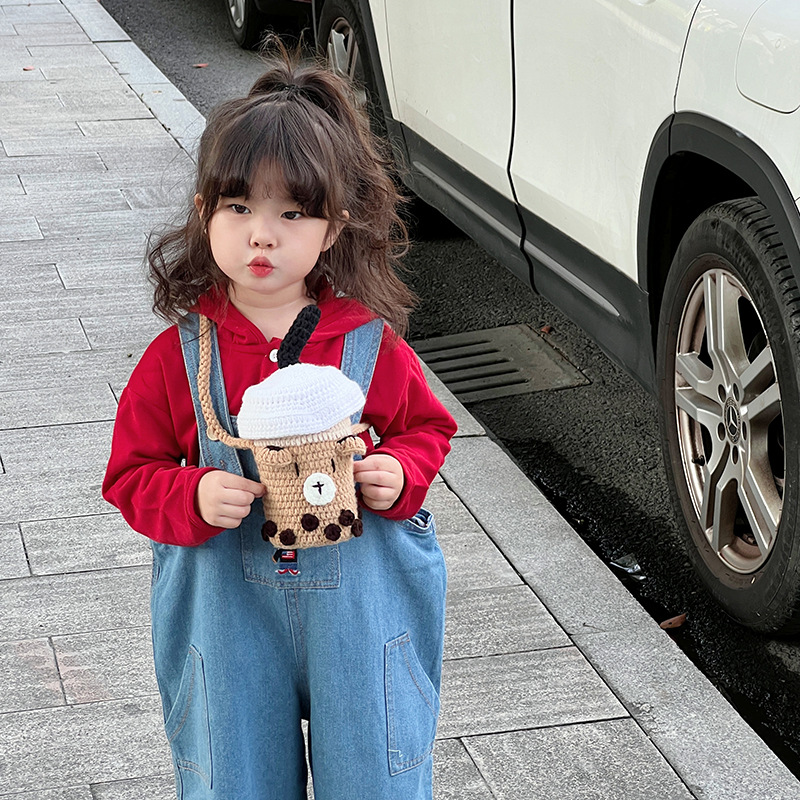 秋冬の新型子供の毛糸の斜めのショルダーバッグのネットの赤い手のかぎ針はミルクの杯を編んで完成品の幼児の間食の包みを包みます。