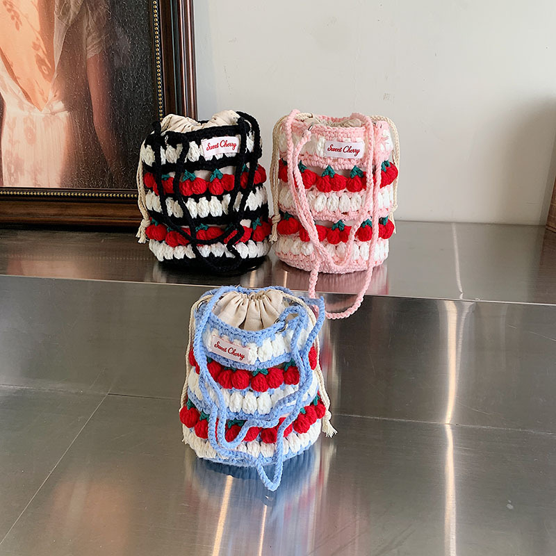 冬の新型ウサギ耳毛糸バッグ手作りフック織り完成品束口バッグかわいいいちごにんじん斜めバッグ萌え