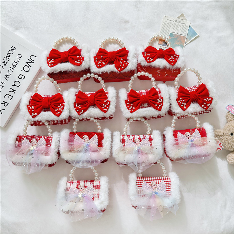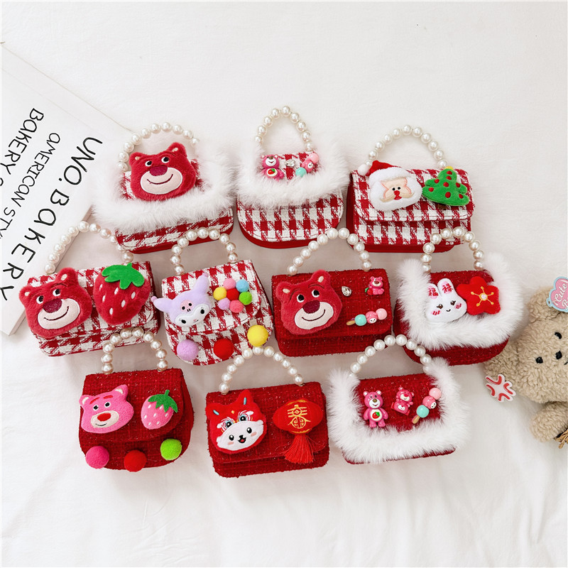 赤い小香風お姫様バッグかわいい正月祝いウサギ毛真珠ハンドバッグ漫画装飾少女ショルダーバッグ