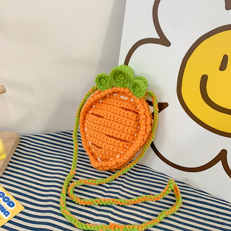 かわいい大根の手作りの編み物の毛糸は漫画のニンジンの子供の斜めのショルダーバッグの冬に果物のカバンを編みます。