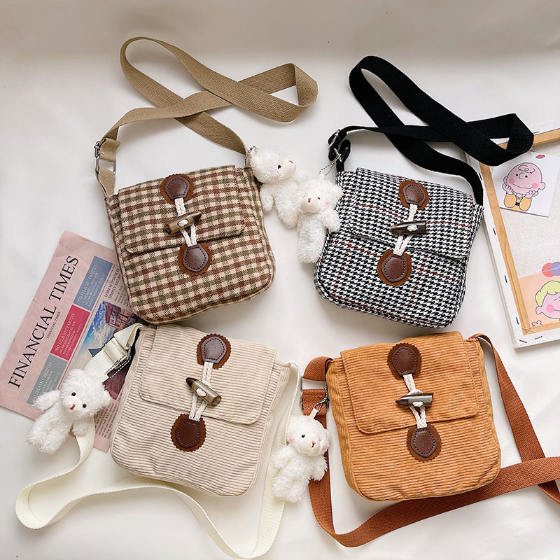 冬の新型子供の斜め掛けの格子のフリースの学院の風のショルダーバッグの幼児は旅行して牛の角のボタンのカバンを掛けます。