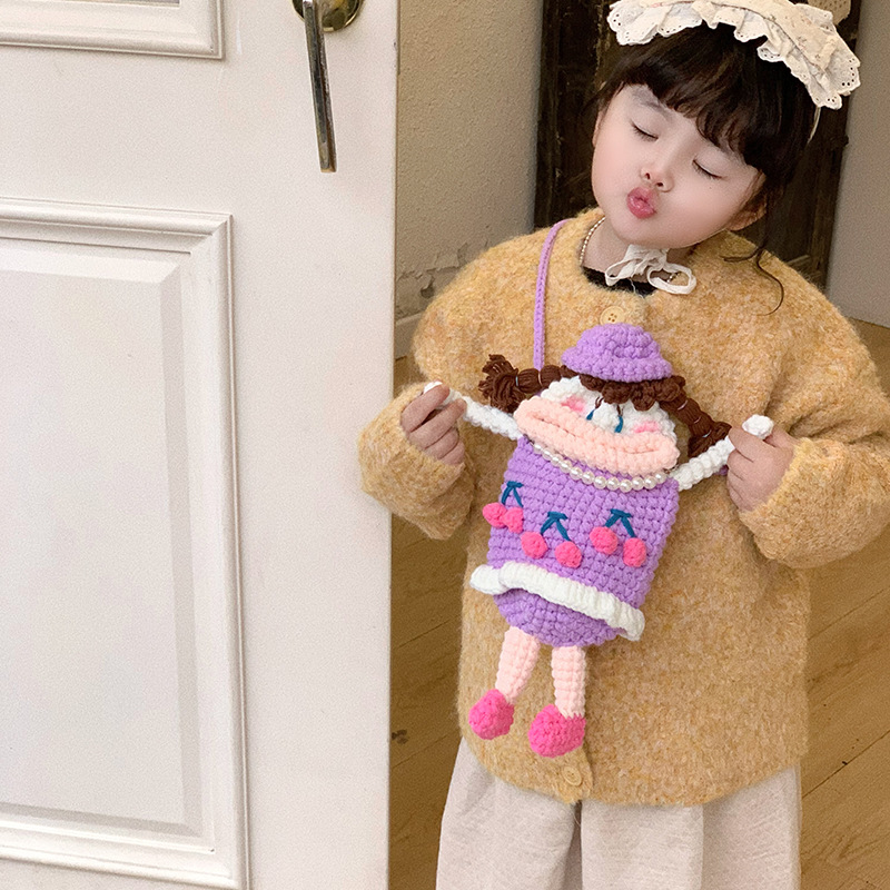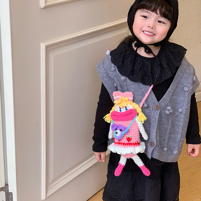手作りの毛糸の子供の包みの完成品のかぎ針編みの漫画のかわいいソーセージの口の王女の斜めな包みのネットの赤い大きい口の妹の包み