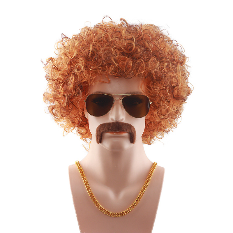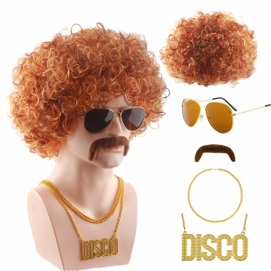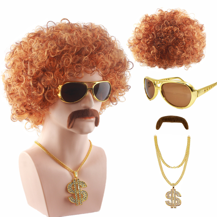 ハロウィーンディスコファン髪ヒップホップメンズかつら混ブラウンかつらパンクDISCOネックレスサングラス