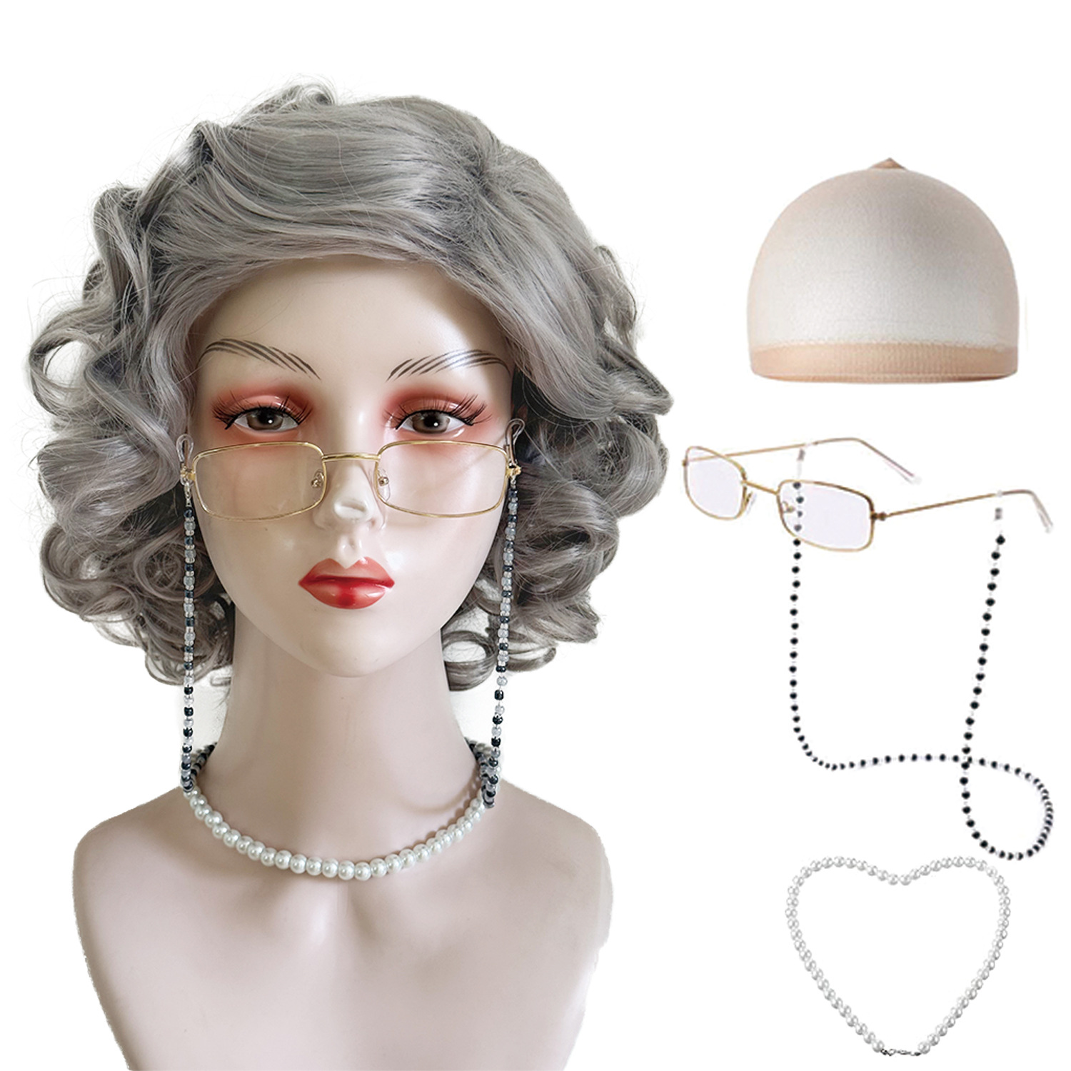 中高年の白いショーのかつらのおばあさんのおばあさんの短い巻き髪の子供の成人の演出の道具