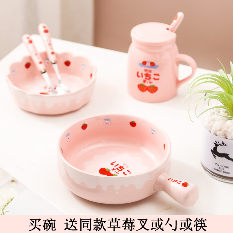 9worピンク明治イチゴ可爱い少女セラミック泡麺ボウルハンドル付き家庭用焼きボウル学生シリアルボウル砂