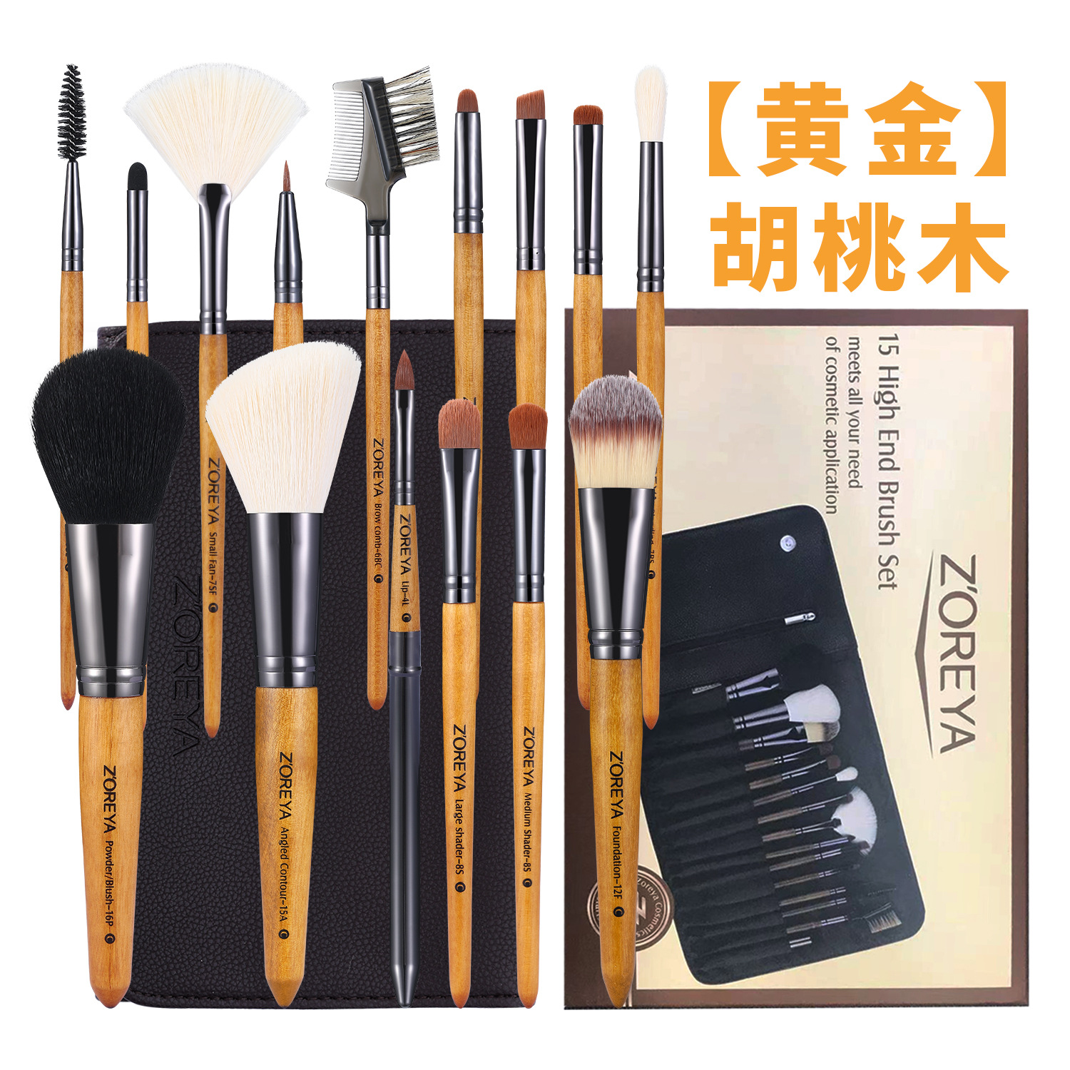 卓爾雅ハイエンド美化粧道具セット黄金胡桃木軽豪華動物毛15本の専門化粧ブラシセット