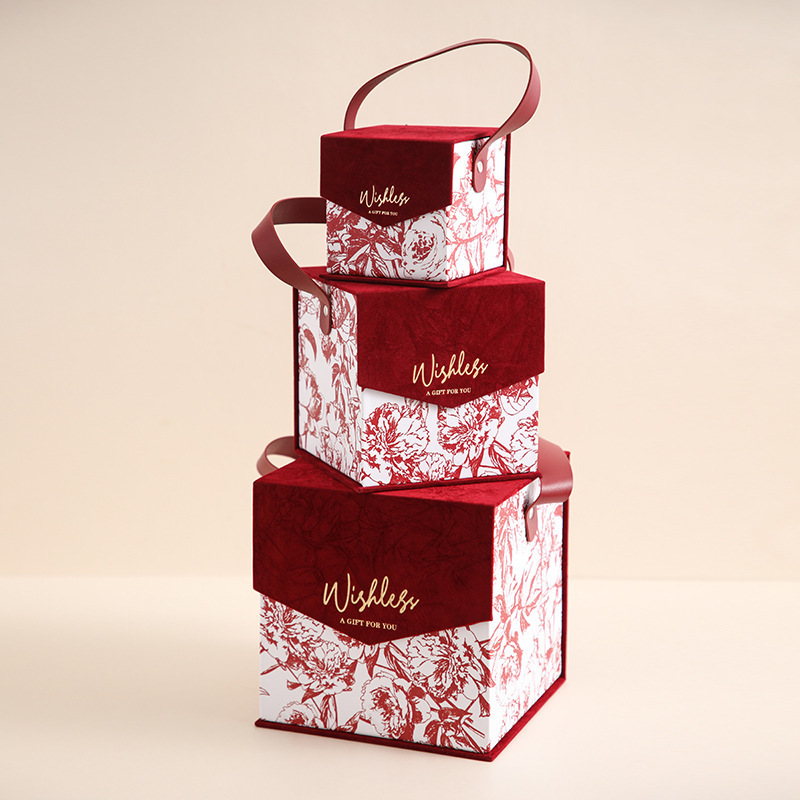 【喜糖箱】革の手持ち式の金箔の赤い綿布のお土産箱のプレゼント箱